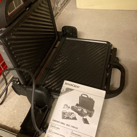 ECG-811 kontaktgrill. Elektrisk grillenhed med ribbet grillplade og låg, egnet til tilberedning og opvarmning af fx sandwich og andre fødevarer. Leveres med netledning og er pakket i original papkasse mærket "plate-pressing stove". Velegnet til brug i køkken eller mindre erhvervsmiljøer, hvor der er behov for en kompakt bordgrill med over- og underplade.Sms gerne på 21386364.Claus. 500 kr stykket eller begge for 800 kr.