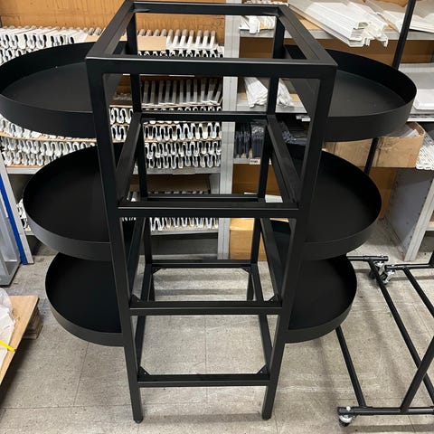 Vi har selv tilføjet to hylder og en skrivebordsplade. Det hele medfølger.