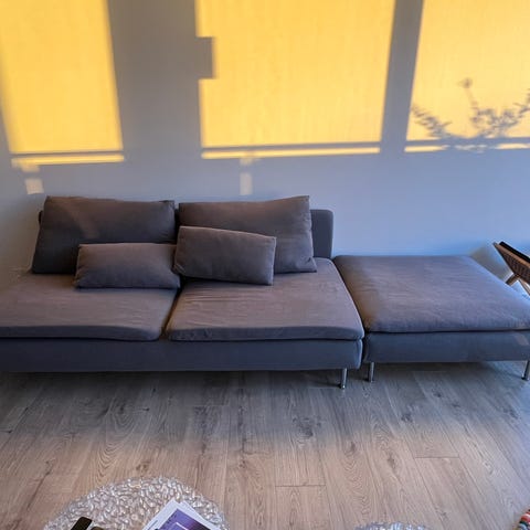 Sofaen er delt i to dele, og benene er ikke monteret men følger med.