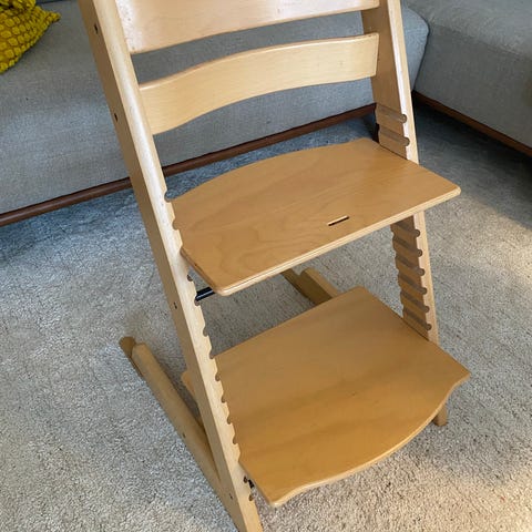 Stokke Tripp Trapp højstol i naturfarvet træ. Højstolen har justerbar siddeplade og fodplade, som kan tilpasses barnets højde. Der er monteret bøjle foran sædet samt fodstøtte med metalstang. Klassisk Tripp Trapp-konstruktion i massivt træ, egnet til brug ved spisebord eller som siddeplads til børn i forskellige aldre, afhængigt af tilbehør og indstilling.