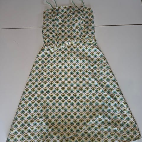 Modellen har lange ærmer, underkjole, lynlås i ryggen og en løs pasform. Materialet er let og glat.