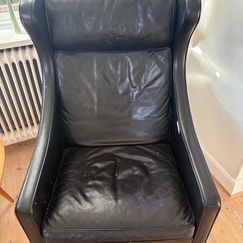 2 højryggede øreklapstole + fodskammel i mørkebrunt læder med rigtig god siddekomfort. Meget lig Børge Mogensen model. Sælges samlet