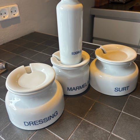 Eva Trio krydderisæt i hvidt porcelæn med korkpropper og metalholder. Sættet består af flere flasker og krukker til opbevaring af forskellige krydderier eller olie/eddike. Beholderne er i lyst porcelæn med trykt tekst og runde korklåg. Metalholderen har bærehåndtag og plads til flaskerne, så sættet kan stå samlet på bord eller køkkenbord. Velegnet til organisering og servering af krydderier i køkken eller på spisebord.