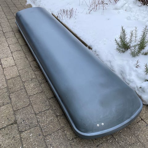 Rigtig fin tagbok i grå med sort bund sælges. Den har været brugt til skiferie. Tagboksen kan monteres på alle tagbøjler, ved brug af de medfølgende beslag. Der er også nøgle med så boksen kan være aflåst når den er monteret på bilen. Boksen måler ca. 230cn X 60cm.