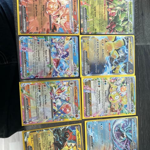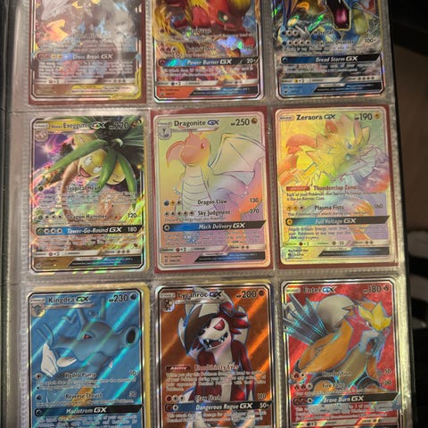 Pokémon samlekort blandet lot med flere GX og EX kort. Kortene på billederne viser blandt andet Gumshoos GX, Solgaleo GX og andre holo- og full art kort i plastiklommer. Sprog på kortene er blandet, herunder japansk og engelsk. Egnet til samlere af Pokémon TCG, både til mappe, display eller som udvidelse af eksisterende samling. Antal og specifikke kort fremgår af billederne. skriv for mere viden.