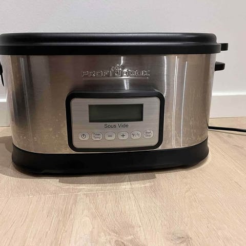 OBH Nordica sous vide kar til tilberedning af mad ved præcis temperaturkontrol. Enheden har rustfri stålkant og indvendig beholder med indsatskurv. Betjeningspanel på forsiden med display og knapper til indstilling af temperatur og tid. Velegnet til sous vide-tilberedning af kød, fisk og grøntsager i vakuumposer i vandbad.
