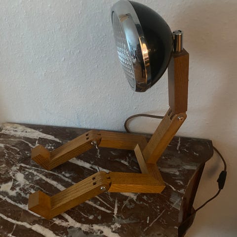 Mini Wattson bordlampe i træ. Lampen har justerbare led, så den kan placeres i forskellige positioner på bord eller hylde. Skærmen er rund og monteret på en fleksibel arm, hvilket gør det muligt at rette lyset efter behov. Velegnet som skrivebordslampe eller stemningsbelysning i stue, kontor eller børneværelse.