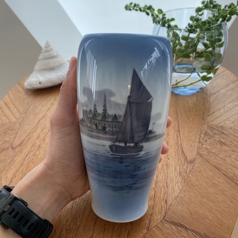 Royal Copenhagen vase med maritimt motiv af sejlskib foran Kronborg. Vasen er udført i porcelæn med glaseret overflade og dekoreret i blågrå nuancer. Bundstempel med Royal Copenhagen-mærke, bølgelinjer og formnummer 3430. 1. Sortering. 17 cm høj