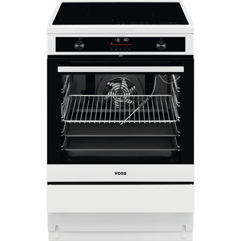 Voss Induktionskomfur i hvid med 4 kogezoner og selvrensende ovnrum med katalyse med Hob2Hood tilkobler kogepladen sig automatisk til emhætte med samme funktion. Rengøringsvenlige pop-ud knapper og stort ovnrum, magasinskuffe til ovntilbehør.