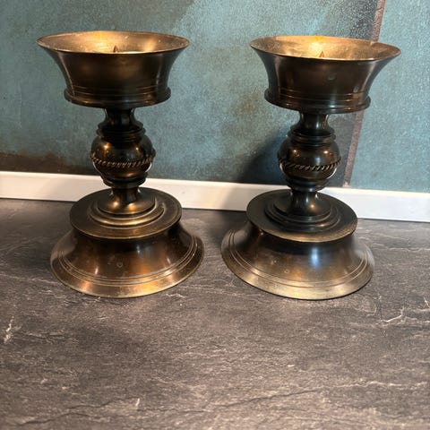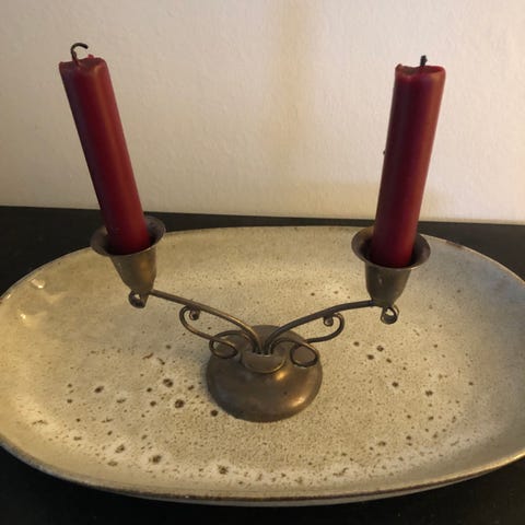 Lysestage til 4 stagelys i gråmalet metal. Lysestagen har et geometrisk, kubeformet design med fire lyseholdere placeret i hjørnerne. Egnet til almindelige stagelys. Højden er ca. 19–20 cm, og bredden er ca. 19–20 cm.