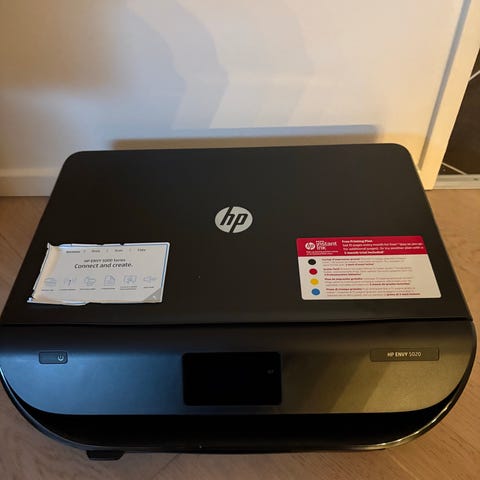 HP Envy 5000 series multifunktionsprinter i hvid. Enheden har integreret farvedisplay på fronten til betjening af funktioner som kopiering, scanning og opsætning. Scannerfladen er placeret under det øverste låg. Egnet til almindelige print-, kopi- og scanningsopgaver i hjemmet eller på et lille kontor.