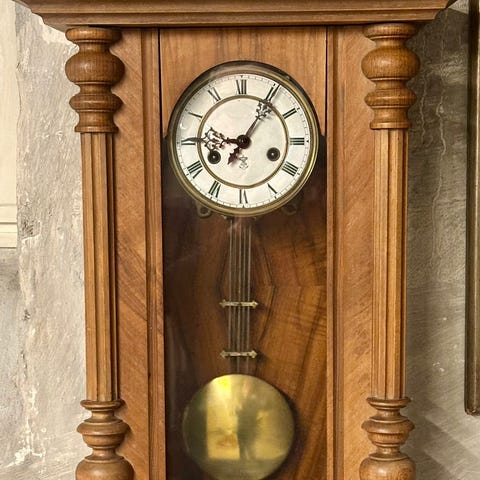 Genfa 614 vægur i brun træ. Uret har rundt messingfarvet urskive med tydelige tal og visere. Nederst er der glasparti med facetslebet mønster og synlig pendul. På bagsiden er agenda modelnummer 614 . Samt slag: bim -bam oplyst.