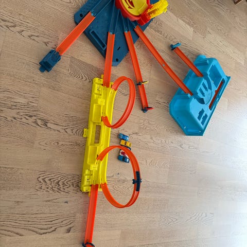 Hot Wheels bilbanesæt med biler. Sættet indeholder forskellige banedele i flere farver samt stor samling hot wheels