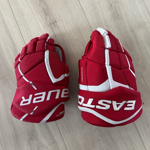Bauer Vapor X600 ishockeyhandsker i størrelse 12". Handskerne er i sort med hvide detaljer og rød inderside ved manchetten. De er polstrede for beskyttelse af fingre, hånd og håndled under ishockey. Håndfladen er i slidstærkt skindmateriale for godt greb om staven. Velegnet til brug på isen til træning og kamp i ishockey.