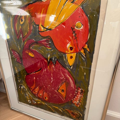 Signeret litografi af Carl-Henning Pedersen. Titel: “H.C. Andersen suite nr. 1”. Sjældent udbudt. Kun trykt i 75 eksemplarer (Paris 1982). Indrammet med passepartout i sølvlakeret træramme. Mål inkl. ramme 72x97 cm. Lysmål 53x77.