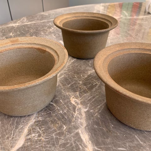 Gryde i i sort farve med rund form og bred åbning. Gryden har to hankeringe i siderne til ophæng eller håndtering. Egnet som dekorationsgenstand