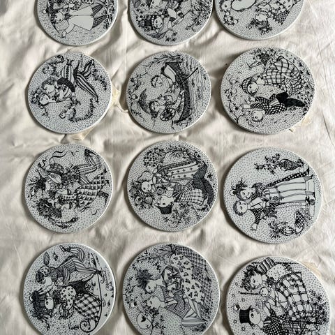 Motiverne forestiller forskellige figur- og hverdagsscener, blandt andet par og familier i forskellige situationer. Platterne har hul i toppen, så de kan hænges op på væggen som dekoration, men kan også bruges som smørebrik/til servering.