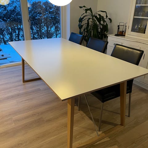 Bredde 101cm, længde 205cm uden ekstra plader. Hver af de tre medfølgende tillægsplader er ca 51cm bred. Med alle tre plader isat længde ca 360cm med plads til 14 (inkl en for hver bordende). Nypris ca 20.800 kr