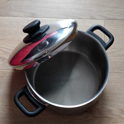 Lyngby (Harlekin) gryde med låg i hvidt porcelæn med blå dekoration. Gryden har lang hank og medfølgende låg. Størrelsen fremgår af målebåndet på billedet, som kan bruges til at vurdere diameter og kapacitet.