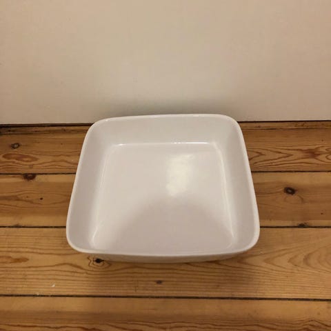 Rektangulært fad i porcelæn i hvid med sort blomstermønster. Fadet har let forhøjede kanter og glaseret overflade. Ca.-mål: længde omkring 30 cm og bredde omkring 14 cm, som vist på billederne med målebånd. Egnet til servering af fx snacks, tilbehør eller mindre retter ved borddækning i køkken og spisestue.