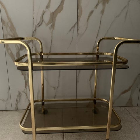 Elegant og trendy barvogn i guldfarvet metal med to glasplader.