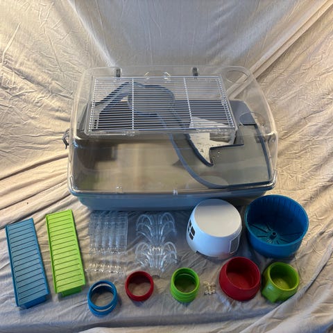 Fint dværghamster bur med diverse tilbehør og drikke automat. Der medfølger også noget tilbehør som dog ikke passer til det her bur.