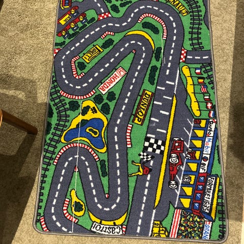 børnetæppe med veje og bymotiv i flerfarvet design. Tæppet har tryk med veje, huse, tog og landskab, som egner sig til leg med legetøjsbiler og figurer. Overfladen er vævet med tydelige markeringer af vejbaner og områder i forskellige farver. Velegnet til børneværelse eller legeområde på gulv.