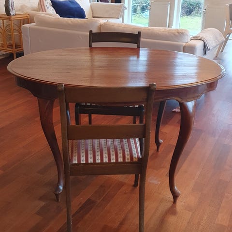 Stolene er på et tidspunkt blevet ompolstret hos en professionel og fremstår uden slid.