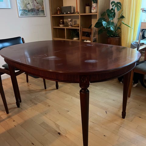 Virkelig fint mahogni spisebordssæt bestående af ovalt bord med klap i begge ender.