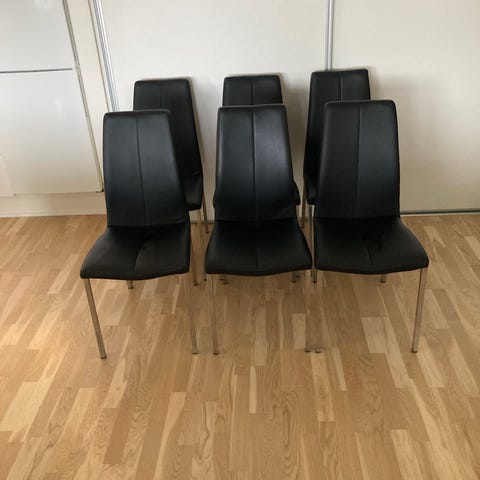 Prima spisebordsstole i ægte læder med god siddekomfort. 6 stole uden armlæn, 2 stole med armlæn. Højden på stolen er 86 cm. Sædehøjden er 48 cm.