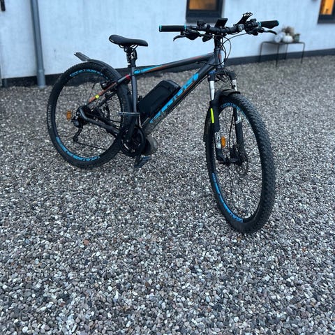 Giant elektrisk cykel til unisex med stelstørrelse L og 27,5" hjul. Cyklen har bredt dæk med mønster egnet til kørsel på både vej og lettere terræn. Der er monteret skærm bagtil og display på styret til visning af bl.a. hastighed og distance. Stellet er udstyret med integreret batteri og el-motor i kranken. Farven er primært sort med detaljer i blå og gul.