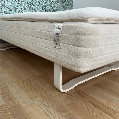 royal Auping-boxmadras i størrelsen 90x200 cm. Madrassen er i en lys beige farve med quiltet top og integreret topmadras. Modellen er en Springer box, som fremgår af mærkaten på siden.