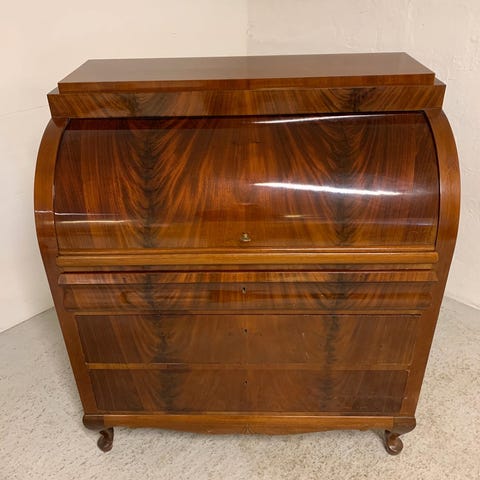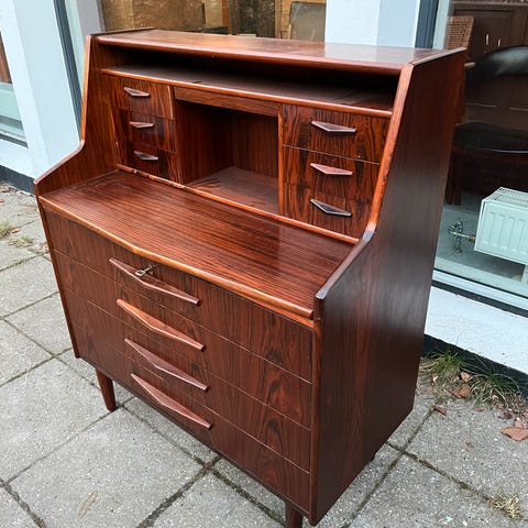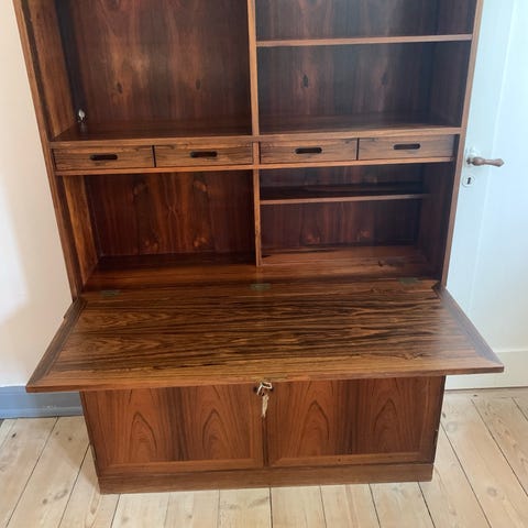 Nederst er der tre brede skuffer med lædergreb. Møblet står på lave ben og er velegnet som kombineret skriveplads og opbevaringsmøbel i stue, kontor eller soveværelse. Et rigtigt fint møbel.