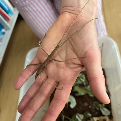Jeg har vandrende pinde i flere aldre/stadier – fra helt små nymfer til næsten voksne dyr. Du kan derfor få en lille flok, der udvikler sig over tid, eller supplere et eksisterende terrarie. De trives bedst i et højere terrarie med grene at klatre på, daglig forstøvning med vand og sprøjtefri blade (fx brombær eller lignende afhængigt af art). Jeg hjælper gerne med kort pasningsvejledning, så du kommer godt i gang.