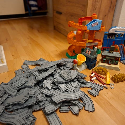 Thomas og vennerne togsæt med motoriseret tog og kran. Sættet indeholder et togbanespor med Thomas-lokomotiv, kran og tilbehør samt et mindre push along-tog. Plastiktogsæt egnet til leg med togbaner for børn.