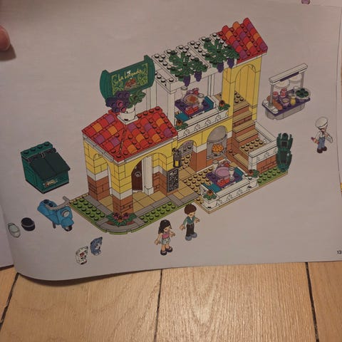 Der medfølger flere minifigurer, herunder en kok, tjener og gæster, samt tilbehør som borde, stole og service.