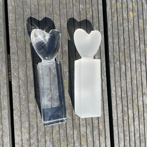 Holmegaard glasstager til juletræslys med hjerteformet top. Figurerne er udført i rødt glas med matterede og klare partier, monteret på rektangulære sokler i matchende farve. Højden fremgår af billedet med lineal som ca. 14 cm. Egnet som dekoration i hjemmet, f.eks. på hylde, reol eller vindueskarm.