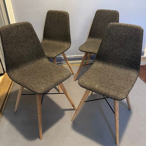 Spisebordsstole, sort Beaver laminat sæde og hvidolierede ben, egetræ. Inklusiv Harvard filthynder. Sælges samlet