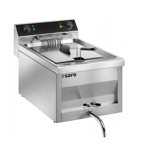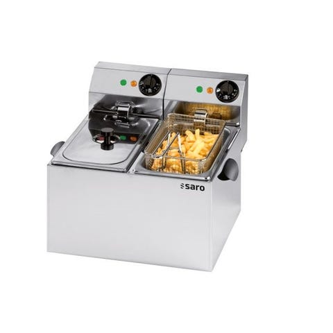 Industriel dobbelt frituregryde i rustfrit stål. Enheden består af to separate friturekar med individuelle låg og betjeningspaneler med temperaturregulering og indikatorlamper. Hvert kar er udstyret med friturekurv med håndtag samt integrerede varmelegemer i bunden. Kabinettet under friturekarrene giver plads til opbevaring af udstyr eller tilbehør. Velegnet til professionelt køkkenbrug, f.eks. restaurant, kantine eller catering, hvor der er behov for samtidig tilberedning i to friturekar.Kun brugt 2 gange i den ene side.SMS gerne på 21386364.Claus
