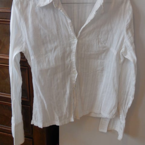 Skjorte til kvinder i hvid/sort bomuld i størrelse M. Skjorten har lodrette striber, V-udskæring og knaplukning øverst foran. Ærmerne er trekvartlange, og længden går ned over hofterne, hvilket giver en løs og behagelig pasform. Velegnet til både hverdag og afslappet brug.