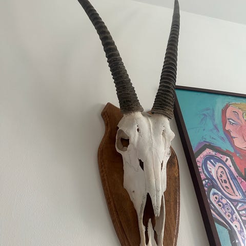 Oryx trofæ i form af en hovedmontering. Dyret har karakteristiske, lange sorte horn og brun-hvid pels med markante ansigtstegninger. Trofæet er egnet som vægdekoration i jagtstue, stue eller lignende rum. Monteringen fremstår som et naturtro, udstoppet hoved, klar til ophængning på væg.
