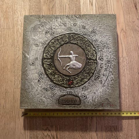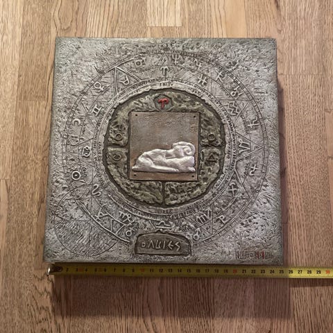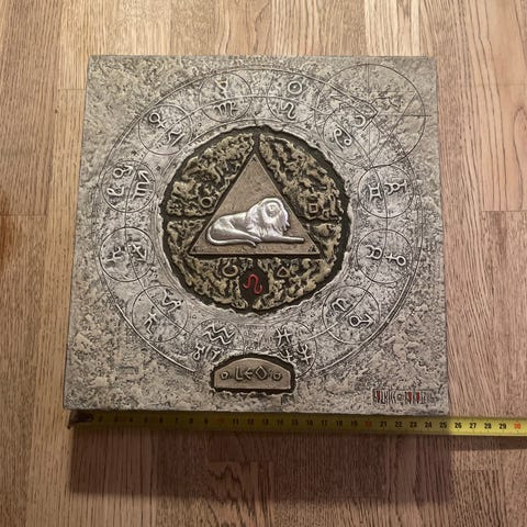 Stjernetegn Tyr vægrelief i kvadratisk format. Motivet viser tyrens stjernetegn i midten omgivet af dekorative symboler. Relieffet er udført i en stenlignende overflade med detaljer i kontrastfarver. Egnet som vægdekoration i hjemmet, for eksempel i stue, soveværelse eller entré. Målebåndet på billederne angiver cirka-mål på siderne, så størrelsen kan vurderes i forhold til vægpladsen.