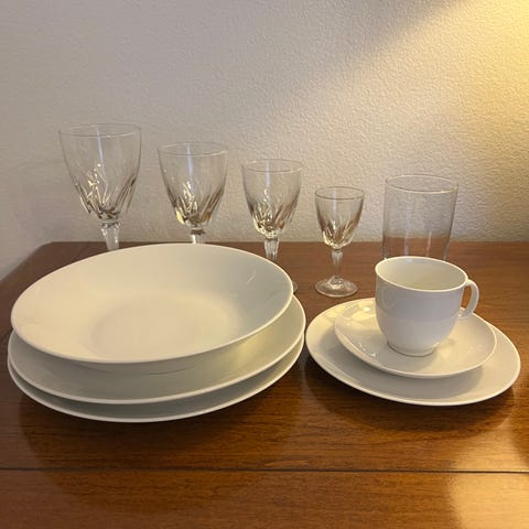 IKEA service og glas sæt i hvid og sort porcelæn samt klart glas. Sættet omfatter: