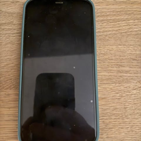 Apple iPhone 12 smartphone med 64 GB intern hukommelse. Modellen har sort bagside og fladt display med notch øverst. Telefonen har dual‑kamera på bagsiden med to linser og LED-blitz. Fronten viser standard iOS-låseskærm. Egnede anvendelser omfatter almindelig telefoni, beskeder, internetbrug, sociale medier, foto og videooptagelse samt brug af apps fra App Store. Skærm og kanter viser synlige brugsspor og ridser, som ses på billederne.