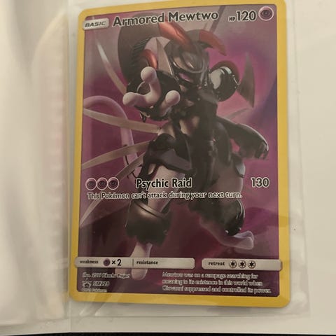 Pokémon Armored Mewtwo samlekort. Kortet viser Armored Mewtwo med angrebet Psychic Raid og 120 HP. Standard Pokémon bagside. Egnet til samling eller brug i Pokémon Trading Card Game.
