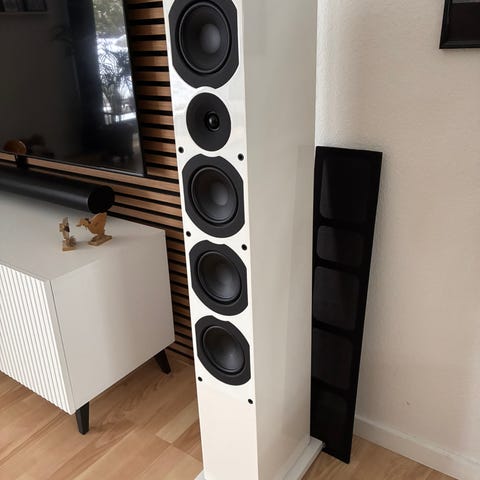 System Audio Saxo 40, i farven satin hvid. Kompakt gulvhøjtaler.
