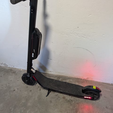 Segway el-løbehjul i grå farve. Løbehjulet har fast styr og bred trædeflade med skridsikkert mønster. Medfølgende Segway oplader til opladning via almindelig stikkontakt. Velegnet som elektrisk transportmiddel til korte og mellem-lange ture på asfalt og faste underlag.
