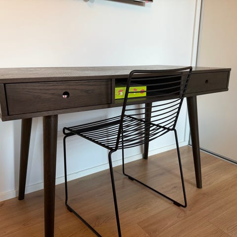 Sød lille skrive bord 115 cm bred 55 dyb 75 høj den er i meget pæn stand. Jeg sælger også en Grete jalk stol samlet pris 3500kr