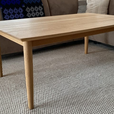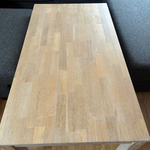 Rektangulært sofabord i træ med massiv, stavlimet bordplade i naturtræ. Bordet har lige ben i træ og en robust konstruktion, der egner sig til brug i stue eller opholdsrum. Overfladen har et markant mønster fra træets årer og samlinger, som giver et ensartet, men levende udtryk. Velegnet som sofabord foran sofa- eller loungemøbler.