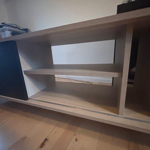 We are selling our TV bord from Jysk in light wood with a sliding black door. It looks as new!